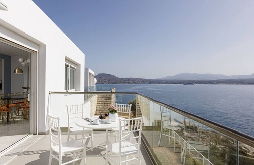 The villa's outdoor spaces are equally captivating, featuring lush Mediterranean gardens, sun-drenched terraces, and shaded areas perfect for relaxing or dining al fresco. As the sun sets, gather around with loved ones and enjoy the mesmerizing colors of the Cretan sky.