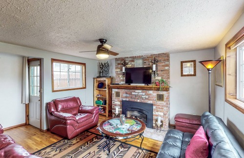 Inside, the cabin is freshly remodeled and ready to entertain! The spacious living room comes complete with plush leather seating and a large TV. The adjacent kitchen comes fully equipped with all of the items you'll need to whip up delicious homemade meals. When mealtime rolls around, dine together at the wooden dining table. Off the kitchen, you will also have access to a separate laundry room and a full bathroom.