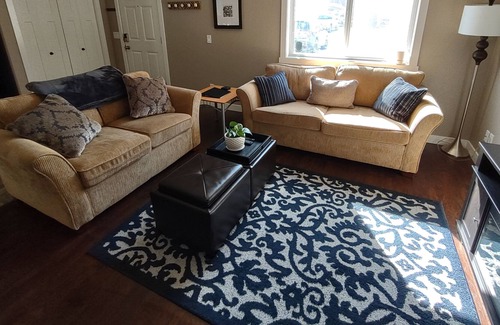 This 2 bedroom suite offers a spacious open concept on the main floor. There is a handy work space, beautiful oak table for meals, an electric fireplace in the living room, a TV with Netflix and Prime and a large fully stocked kitchen! Down the stairs is two bedrooms, laundry and the bathroom. Each bedroom has 100% black-out blinds for those needing to sleep during the day.