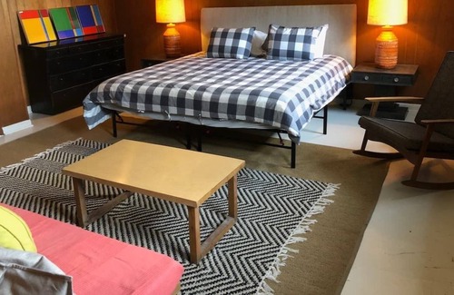 Perched on the top of a hill with spectacular views, this beautifully renovated mid-century modern art collectors house sits in the bucolic neighborhood of Kripplebush, NY. The interior has been painstakingly decorated with collectible modern furniture and art bringing a sophisticated and worldly feel to this stunning countryside retreat. Relax and enjoy the mountain ridge views from our newly installed state of the art spa.