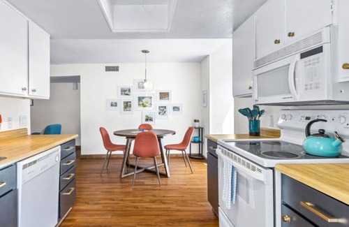 Live your best Palm Springs life at our whimsical, spacious & light-filled 2-bedroom condo. Located in the resort-like Palm Canyon Villas, our stylish, top-floor unit features comfy furnishings to help you relax & unwind. Enjoy modern amenities & stylized nods to Palm Springs' colorful history. Have morning coffee or sunset dinner al fresco on your private balcony overlooking the mountains. Take advantage of all the amenities our community offers and call this colorful gem home during your stay!