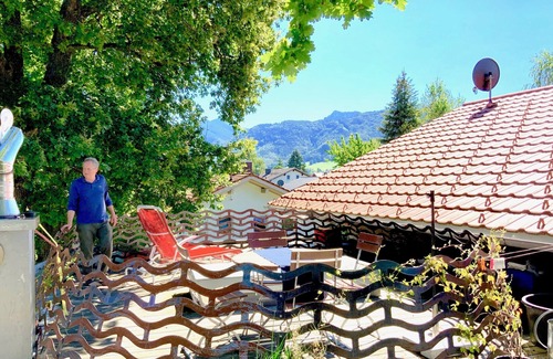 Pretty unusual is the own approx. 25m2 large roof terrace. There you sit under the branches of the oak trees, is not visible and has a beautiful view of the gardens of the area and the mountains.
