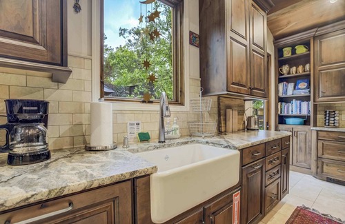 Gather around the large, rustic-style wooden dining table that seats eight, ideal for shared meals, games, or simply catching up over coffee. Adjacent to the dining area is a spacious, fully equipped kitchen with a warm, rustic aesthetic. The centerpiece is a beautiful wooden island with a light granite countertop and three cushioned, rope-leg stools. Medium-toned wooden cabinetry, a built-in cooktop and oven, decorative backsplash, chimney-style vent hood, full-size refrigerator, and dishwasher ensure you have everything needed to cook and entertain with ease.