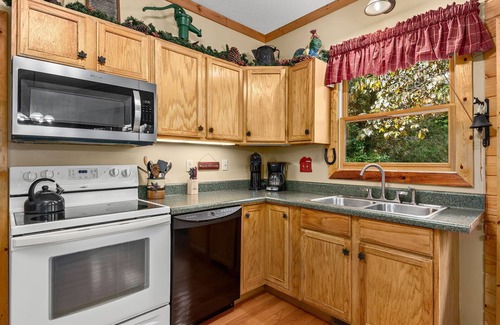 Buckeye Cabin is one of only three cabins onsite, with plenty of room to accommodate up to 12 people. (The base rate covers up to 8 guests. Each additional guest is $25/night.) Modern mountain decor, large deck, five bedrooms (1 king bed, 3 queen beds, 2 twins) plus a family-room futon and three full baths combine to make you comfortable while you play pool, enjoy the flat screen TVs, or just relax on the deck. We allow up to 2 well-behaved dogs, but ask that they not be allowed on the furniture or beds.