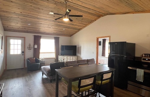 Inside, you'll find two cozy bedrooms, two full bathrooms, a fully equipped kitchen, and a comfortable living area with all the modern amenities, including WiFi and laundry facilities. Whether you’re hiking, floating the river, or simply unwinding on the porch, you'll enjoy sweeping views of the peaceful Ozark countryside.