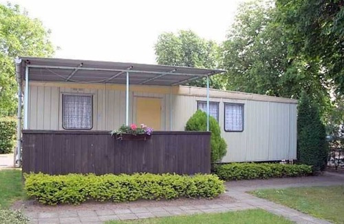 The bungalows (caravan) (about 23 m² caravan) are simply furnished. They consist of the living area with the sitting area and TV, the master bedroom with double bed, the children's bedroom with bunk beds, the kitchenette and the toilet with a sink. The Duchen are located in a separate building. In front of the bungalow you will find a furnished, covered terrace.
