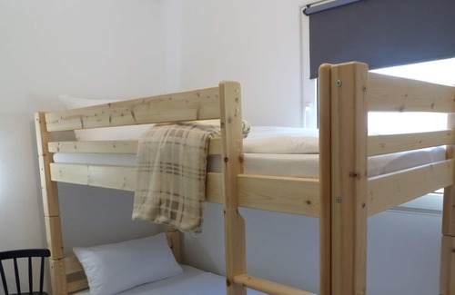 Two bedrooms (16 sqm each) each have two bunk beds as well as a single bed, wardrobe, wardrobe, seating and sink.