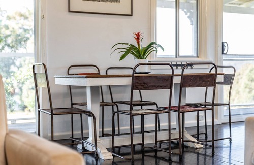 The 1960’s house was re-sited from Forestville in 1997 and has a country comfort relaxed homestead feel. Take in the magnificent backdrop of open fields, tall trees and views to Myall Lakes from the four wrap around verandahs, each with cozy spots to sit and relax and take in the serenity.