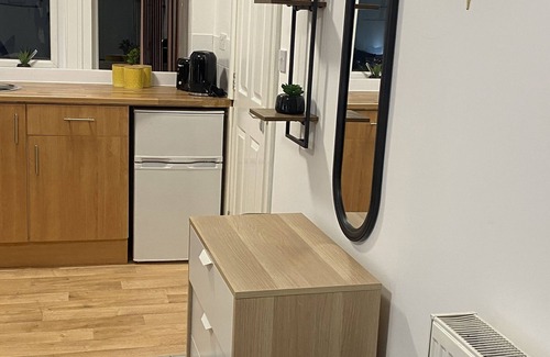 This stylish clean 1-bed/1-bath Ensuite Room, conveniently located 1.8 mile less than 7 mins away from the town centre, and able to sleep 2 guests comfortable. There is a double bed and mattress with a small table and chair.