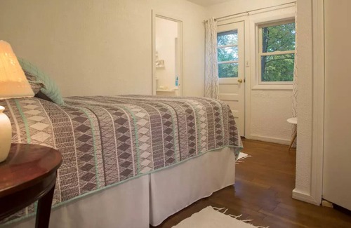 Our second story apartment consists of a bedroom with attached bathroom and a living room with open kitchen. There is a sofa bed in the living room and a small room off the living room with a single bed. The access to the back deck is from the bedroom. The apartment has many windows and it is surrounded by lots of trees.