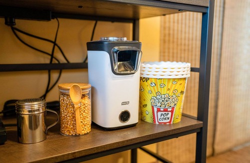 Inside, you’ll enjoy a fully equipped kitchen with sharp knives, durable pots and pans, and some added treats: a fun, complimentary popcorn machine with popcorn ready to pop and a smart, easy-to-use waffle maker for delightful breakfasts. Both bathrooms feature powerful blow dryers and makeup mirrors, plus there's high-speed WiFi, Smart TVs, games, and a luxurious jetted tub in the master bath. Step onto the deck for fun views of the adventure park just across the way.