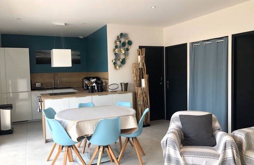 From a main room with a sitting area: sofa with 140 X 190 bed, kitchen units containing all the crockery, flat screen and low sideboard. In addition, the kitchen is fully equipped: freezer-fridge, induction cooker and pyrolysis oven, dishwasher, washing machine, coffee maker, toaster, kettle, etc.