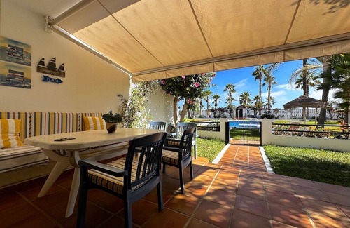 LA CALETA 'Beach & Golf' is a sensational semi-detached villa on the beachfront for up to 6 people, with direct access to the beach, with a private garden-terrace that gives access to the communal pool, with outdoor furniture, and a parking space within the development.