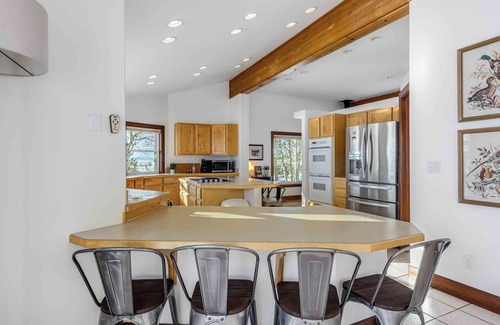 Step inside, and it's easy to see how this home was designed with connection and relaxation in mind. The main floor is open and inviting, with a sunlit living room that practically demands you kick off your boots, sink into the plush couches, and unwind by the fireplace (currently not in use). The dining area, with its table for 12, feels ready for big family meals where stories and laughter flow as freely as the wine. The fully equipped kitchen, with its sprawling counter space and camp chef stove just outside on the deck, makes cooking together an event in itself. And when dinner is done, that same deck becomes the perfect spot for stargazing or s'mores around the propane fire pit.