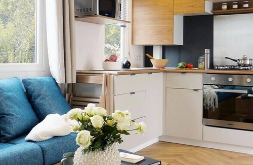The Mobil Home includes a kitchen area equipped with refrigerator, microwave oven, hob, crockery.
