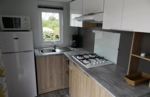 Accommodation: Located in the mobile home rental district, it consists of a bedroom with a double bed, a bedroom with 2 twin beds and a living room.Kitchen equipped with sink, fridge-freezer, gas hob, dishes, microwave, electric coffee maker and TV. Bathroom with shower and sink, separate toilet. It is also equipped with a large covered terrace, barbecue and garden furniture.Sheets not provided, non-smoking, pets allowed (only dogs, one per accommodation).