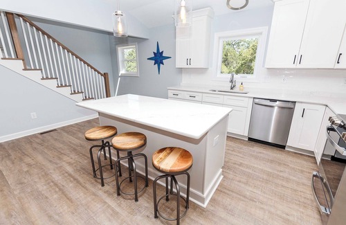 Mid Level: Great room with flat-screen TV and screen porch access, kitchen with gas stove and counter seating for 3 and dining area seating 8. Master Bedroom with 2 Doubles plus private bathroom, Bedroom with 2 DuoBunks, flat-screen TV and 2 desks and a full hallway bathroom. Laundry area with washer and dryer.