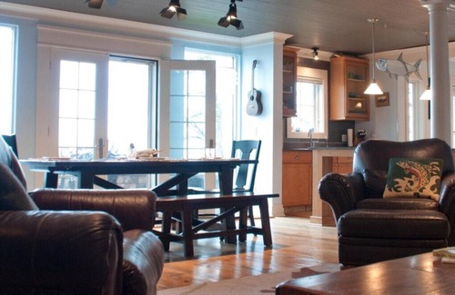 The open living space features plush sofas encircling a gas fireplace with large lakeside windows to take in the panoramic views of Pelican Lake.