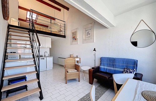 Charming one-bedroom mezzanine apartment for 4 people, fully renovated with new and harmonious furnishings. It includes a living room with a non-convertible sofa, an open-plan kitchen, a spacious mezzanine bedroom with a double bed and a single bed, a ground floor bedroom with a double bed, a bathroom, and a toilet. Quick access to the beach.