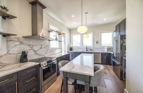 Prepare gourmet meals in the fully equipped kitchen, complete with high-end appliances, quartz countertops, and ample seating for dining together as a group. Or, fire up the grill and dine al fresco on the patio overlooking your private pool and hot tub oasis.