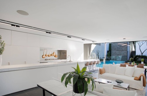 Step inside the main house to discover an open-plan kitchen, lounge area and dining room where soaring ceilings and premium finishes create an atmosphere of refined elegance. The designer kitchen features stone benchtops and premium appliances, while the ground floor flows effortlessly through spacious living areas to reveal a comfortable second TV lounge with double sofa bed, perfect for casual relaxation. Two beautifully appointed bedrooms grace the ground level - one featuring twin single beds, another with a queen bed, both serviced by pristine bathrooms with premium fixtures and luxury finishes. One bathroom boasts a luxurious bath and shower combination, while the other features a walk-in shower for convenience. Move to the first level where the master suite awaits: a sanctuary complete with king bed, private balcony overlooking the pool area, and an opulent ensuite bathroom featuring double vanity, bath, and shower—even a TV for ultimate indulgence.