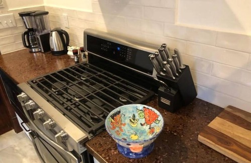 The kitchen is sleek and modern, with a gas stove with double gas oven, microwave, large refrigerator, dishwasher, hot water kettle, coffee maker, toaster, and everything you need to make a fabulous meal. The kitchen countertops are made of concrete and recycled glass. The kitchen island has a small seating area and the countertop itself has a feature that is guaranteed to wow guests.