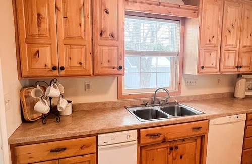 This property features a spacious, fully-equipped kitchen, a breakfast bar with two barstools, and a coffee bar.