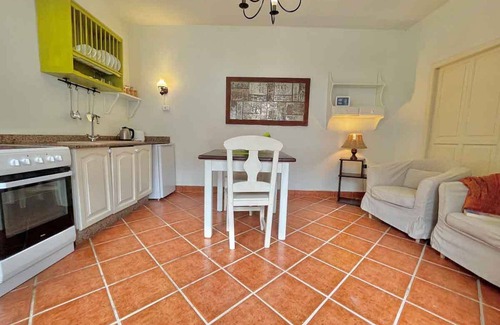 Large 1-bedroom apartment with capacity of 2 guests. Rustic decor, direct access to the shared patio from the living room and the bedroom. Twin bedroom with en-suite bathroom equipped with bathtub and hairdryer. Living room with equipped kitchen with ceramic hob, fridge-freezer and kitchenware. Dining table with chairs, seating area with TV. Optic fiber WiFi. Cleaning fee of 20€ not included in price.