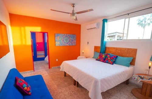 Casa Lola is a cute & colorful 2 bedroom apartment in the heart of downtown, only a block away from the emblematic malecón of La Paz, and close to the best bars and restaurants in town. The internet is high speed with fiber optics, so it is perfect for those zoom calls and with a view of the ocean. It has a small kitchen with a gas stove and oven to prepare you basic meals. The main bed room has a king-size bed and there is also a side bedroom with a double bed, so it may fit up to 4 people. Best location in town!