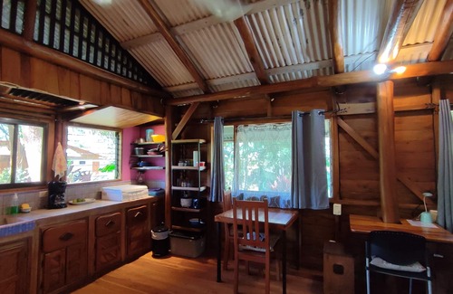 The house is a cozy cabaña offering a covered parking space on the ground floor and a comfortable studio space on the upper floor. Most of the house is built with local tropical timber from reforestation projects, including teak floors and beams and pochote walls, giving it a natural and authentic feel.