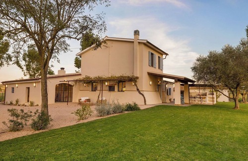 The 3,000 sq m fenced garden is adorned with cypresses, olive trees, eucalyptus and aromatic shrubs, as well as a small organic vegetable garden. Outdoor spaces include a portico and vine-covered pergolas with seating areas, as well as a bamboo pergola equipped with a dining table, barbecue, induction hob, and sink. The property is accessed through an automatic gate, and a parking area is conveniently located near the villa.Please notice that photos are taken in spring, therefore flower blossoming, and the colours of the gardens' grass could be different at the moment of your arrival at the villa.