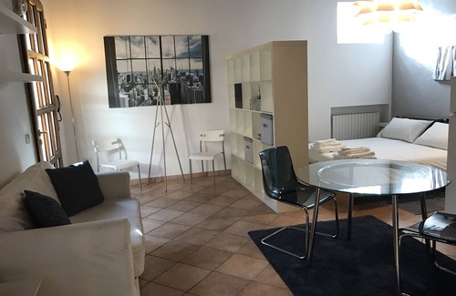 Brand new studio in the most residential area of Bologna. Composed of sleeping area with double bed, living area with sofa, table with chairs, equipped kitchen and large bathroom, private garden with outdoor dining area. It overlooks a garden, quiet, equipped with every comfort, sheets, towels, toaster, Nespresso, stereo, TV, washing machine, perfect for couple (or family with child).