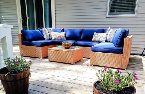 A fully fenced large backyard is the perfect place to let your dog (or kids) play, lounge on the furniture and enjoy smores by the firepit.