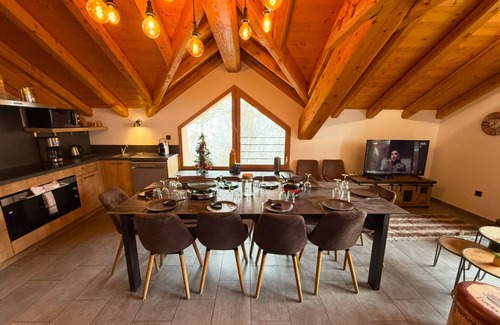 Luxury chalet composed of 2 large apartments for 12 people. It is located in the hamlet of Sierroz, 1.2 km from the center of Valloire and the shops, 500 m from the Moulin Benjamin lift and the ESF meeting point. Ski shop and small shop 500m away. Regular free shuttle at 200m