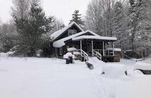 Authentic mountain chalet surrounded by forest. Private location off a quiet road, 3 miles to Stratton Sun Bowl (a 7-minute drive). Spectacular mountain view & large lawn. Swimming hole at brook on property. Fire pit, propane BBQ, picnic table. Front & back porches w/ hammock, table & chairs. VCR/DVD & videos, boardgames & puzzles, kids toys, turntable & records, Satellite Internet & WiFi 20-100 mbps, TV & Roku. Gas heat, wood stove, pellet stove. Dog friendly (sorry, no cats due to allergies).