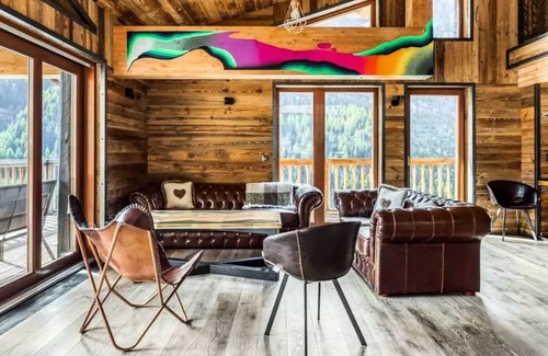 Residence: Make the time for a wonderful stay at the luxury Chalet Raven in Tignes. Its 650 m² make it the most spacious of the group in Tignes les Brévières . Its subtle eclectic decoration mixes traditional Alpine wood and stone with offbeat colors and tags from the Savoyard urban art collective Les Allemandes Crapules . Which makes it a rare place with a strong personality and voluptuous comfort. A diamond ! In the evening, after a dip in the swimming pool in the common areas, you will have plenty of time to cook or taste our chef's delicious dishes, before taking part in games of billiards accompanied by your favorite cocktails.