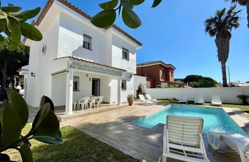 La Barrosa and Sancti Petri beaches are close by. There is a small supermarket within walking distance. Mercadona and Lidl are less than five minutes by car away. The villa is situated in a very quiet area, and you can take a walk in the marshes, just across the main road. This accommodation does NOT allow pets. Swimming pool available all year.