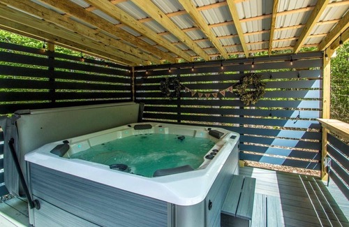 Step outside and indulge in the luxury of a private, covered hot tub on the deck, or gather around the fire pit with comfortable seating to share stories under the starlit sky. The porch features a grill and seating area, perfect for savoring meals al fresco.
