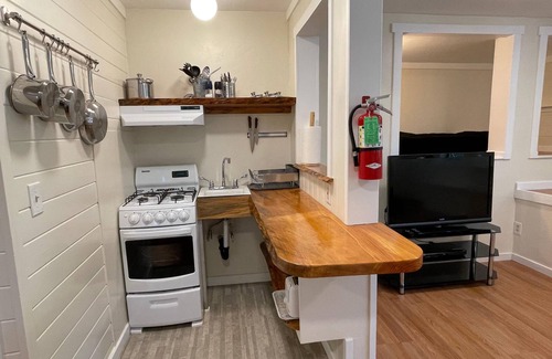 The perfect couples or small family retreat! This large studio hosts a queen size bed in a private sleeping area, a twin loft bed and a full size futon. This is a quiet place close to all Yosemite attractions!