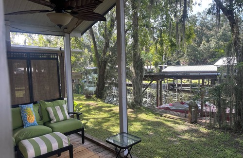 Your Astor adventure begins at this delightful 1-bedroom with Queen Bed cottage. Step inside and feel right at home in the cozy living room with Reclining Sofa and 2 large twin beds for extra sleeping space. Enjoy the nice amenities like an iron, hair dryer, heating, and AC. We can't wait to welcome our guests to this cool retreat. We look forward to hosting you at our place. You can park your boat and boat trailer here, comes with your own Boat Dock for fishing and boating. Screen Porch direct waterfront. Convnient to stores, restaraunt, river, springs and beaches.