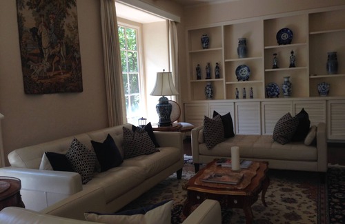 Carmel Charm and Elegance. An enchanting stone home built by a famous architect in the 1920's.This home features 4 plus bedrooms and 4 baths. The master suite consists of two rooms with a queen size bed and a private bathroom. There are three bedrooms on the first level, one with two twin beds and private bath and another with a queen and a private bath. There is a charming Sun Room adjoining the large guest bedroom on the first floor that can be used as an additional bedroom if needed in which there is a single twin bed. On the second floor there is the fourth charming room with a full bed and a private bath. There are beautiful hardwood floor throughout the house. The kitchen has recently been remodeled with carrera marble and new stainless steel appliances with a laundry room equipped with washer and dryer off the kitchen. This is truly a Carmel original manor located at the top of Ocean Ave. The living room is elegant spacious with high vaulted ceilings and a fireplace with is great for entertaining. There is a 40' cable tv that is encased in a shelf in the living room that is covered when not in use. The formal dining room looks out into the garden. From the kitchen or sun room you can walk out to the patio and have dinner alfresco. There is patio seating with a table and umbrella as well as an outdoor bar b que for entertaining!! The stone manor is approximately a 5 minute drive straight down Ocean avenue to town or e a leisurely 15 minute stroll to town. Carmel Beach is approximately an 8 minute drive and Carmel Valley is 10 minute drive away.