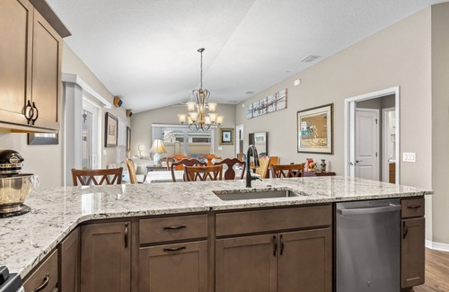 Your master suite is a true retreat, featuring a king-size bed, a Smart TV, and a cozy sitting area. The ensuite bath pampers you with double sinks, a walk-in shower, and a generous walk-in closet. The guest bedroom offers a queen-size bed and its own Smart TV, just steps away from the guest bathroom with a tub/shower combo. Plus, an inside laundry room adds effortless convenience to your stay.