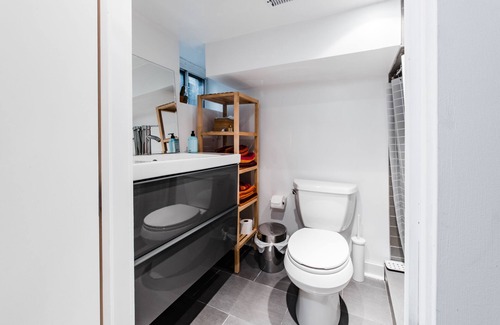 Step into a delightful semi-detached 2-bedroom, 3-bathroom home. Inside, you'll find an inviting open-concept living and dining area adorned with stunning mid-century furniture. The modern, well-lit kitchen adds a touch of brightness to the space. This house also features a finished basement with a den, and a tranquil backyard where you can unwind while watching grapevines thrive.