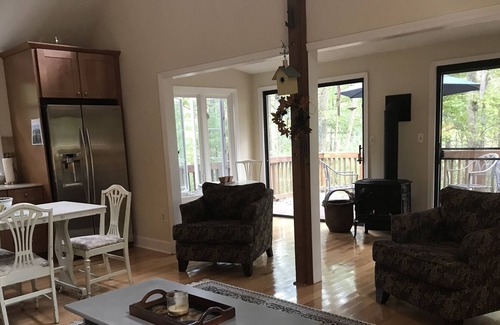 Quaint, comfortable newly updated two bedroom one and a half bath cabin nestled in the woods with all new amenities, including fully equipped kitchen with