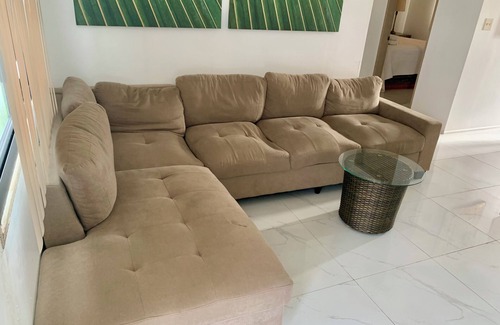 Step into a bright and inviting space with fresh tile flooring and thoughtfully chosen furnishings. The living room features a plush sectional sofa, coffee table, and TV for relaxing evenings in. Adjacent is a dining area with seating for six—ideal for meals or game nights.