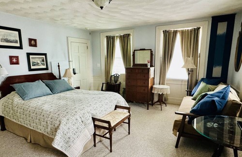 Single 3rd floor room that accommodates up to 3. Queen bed & twin convertible with Private ensuite baths, on-site parking, breakfast, AC, TV, garden, deck. Smoke-free, Wi-Fi. Quiet neighborhood yet 10-15 minute walk to all major attractions. Historic Federal home built in 1809 but with modern creature comforts.