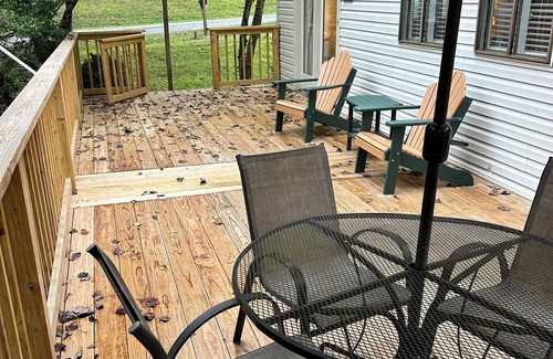 The new, large deck has a table, chairs, and a propane grill. The cozy upper deck off the master bedroom is perfect for that morning jo. The home has central heating and A/C, high-speed fiber optic internet, washer and dryer, and dishwasher.