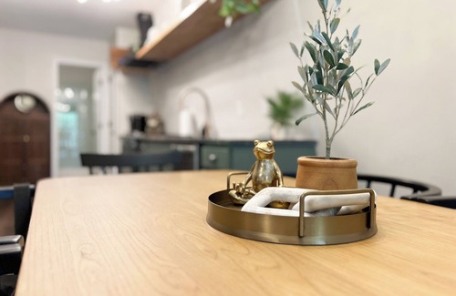 The living room is a perfect example of the home's eclectic style, with a blend of modern and vintage furnishings, statement pieces, and eye-catching art. Sink into the plush sofa or armchairs where you can watch your favorite movie on the large flat-screen TV.