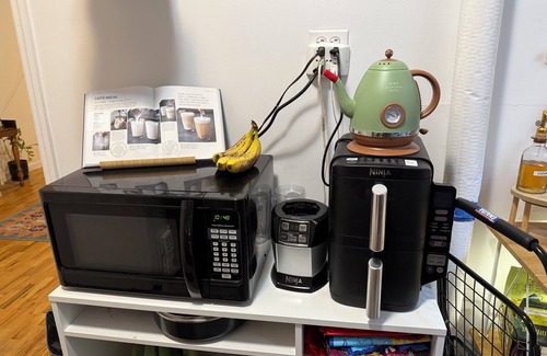 The space features a cozy queen bed in the bedroom and a MASSIVE couch in the living area, complete with a pull-out sofa for extra guests. You'll love the abundance of natural light that fills the apartment during the day, creating an inviting atmosphere to relax, work, or cook. The full-size kitchen is fully equipped and includes an espresso machine with provided coffee! The kitchen also comes with all of the most useful appliances like microwave, blender, air fryer, stove, oven, toaster, hot water kettle, and more!
