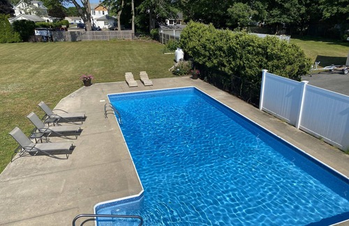 1 1/2 blocks from the water! Beautiful 4BR/2.5 BA beach area home (sleeps 9), close to marina and town beach. Property includes in-ground pool and 1BR/1BA guest house (sleeps 4). A spacious colonial-style main house, carriage house and potting shed share a bright sunny half-acre. Fully fenced in backyard makes it an ideal setting for families.